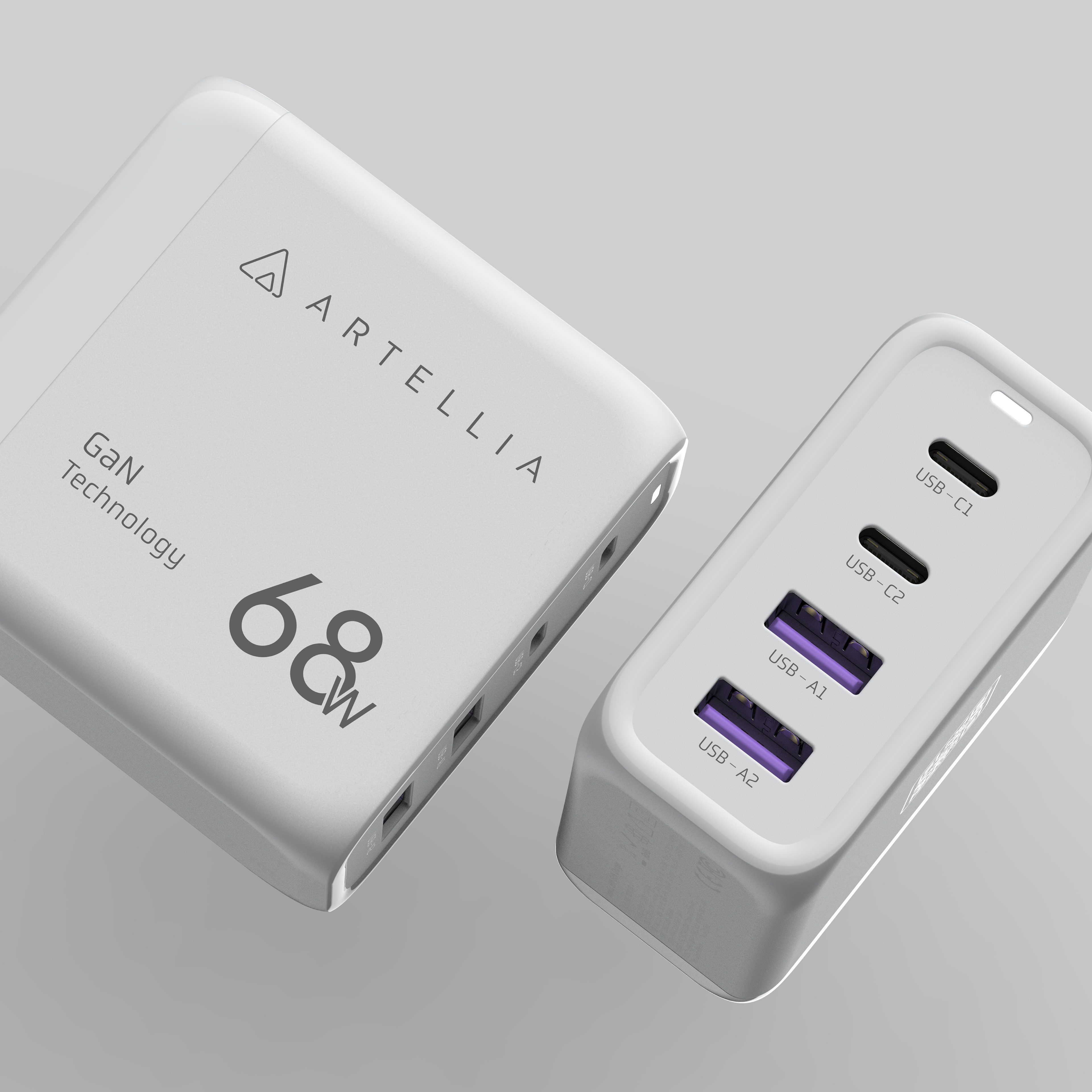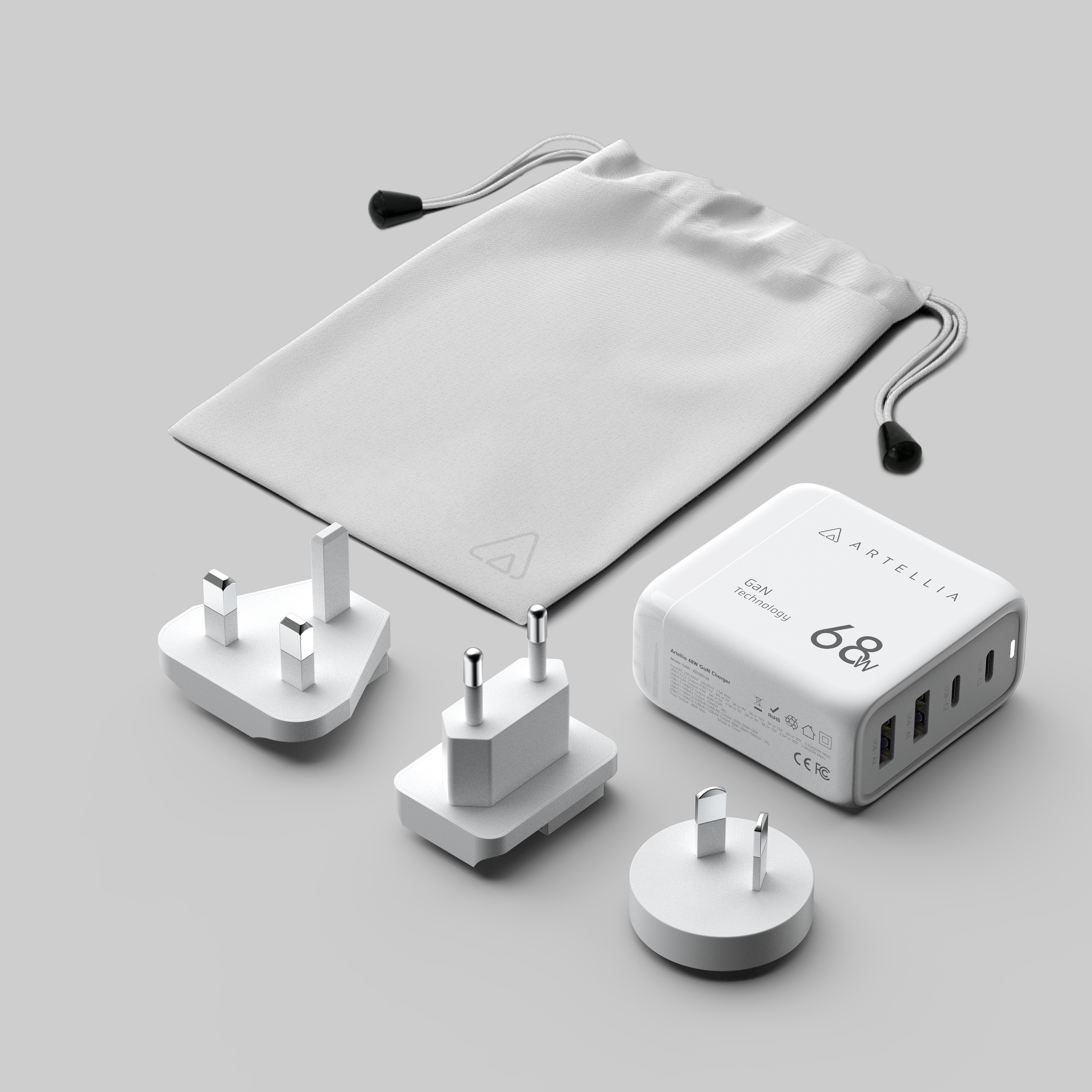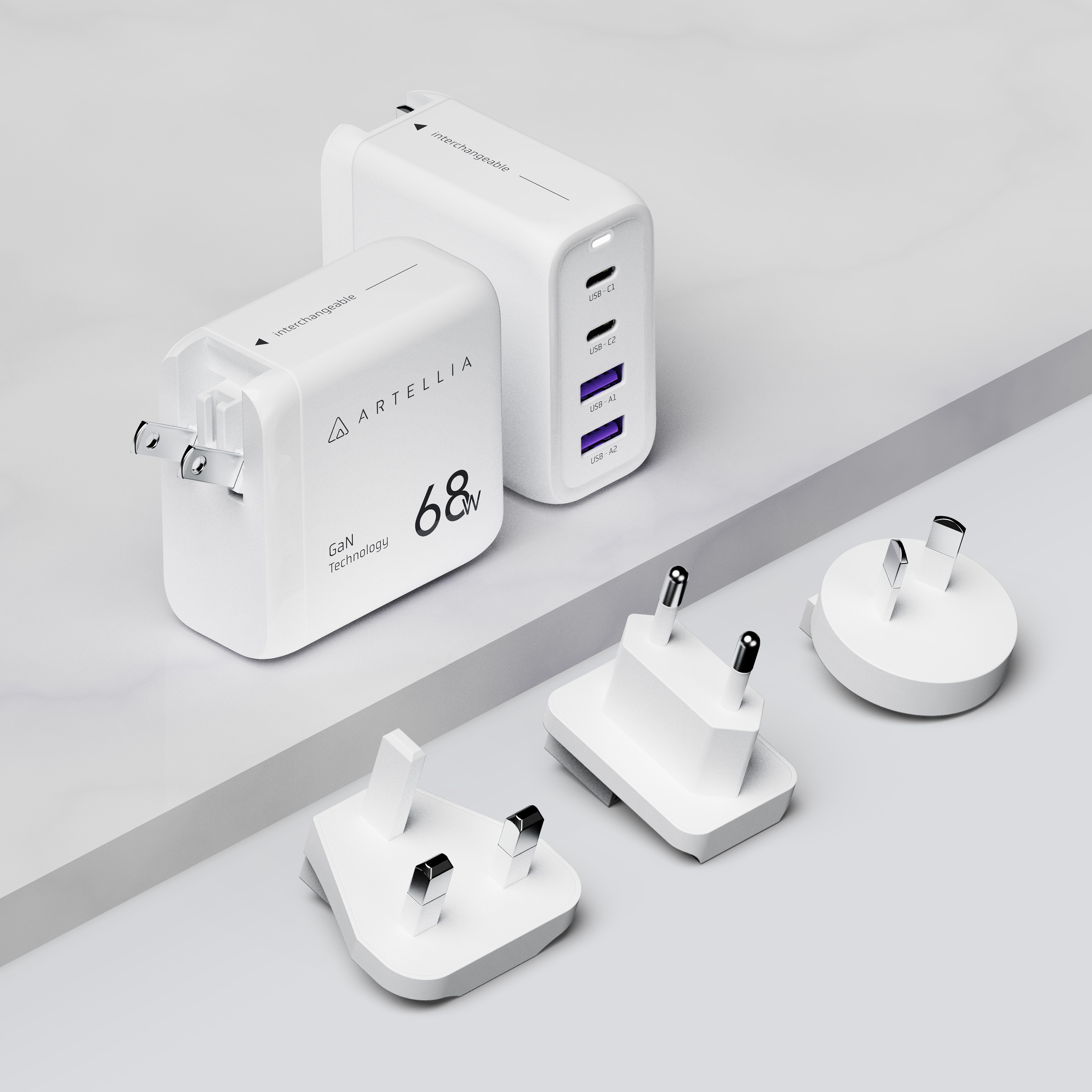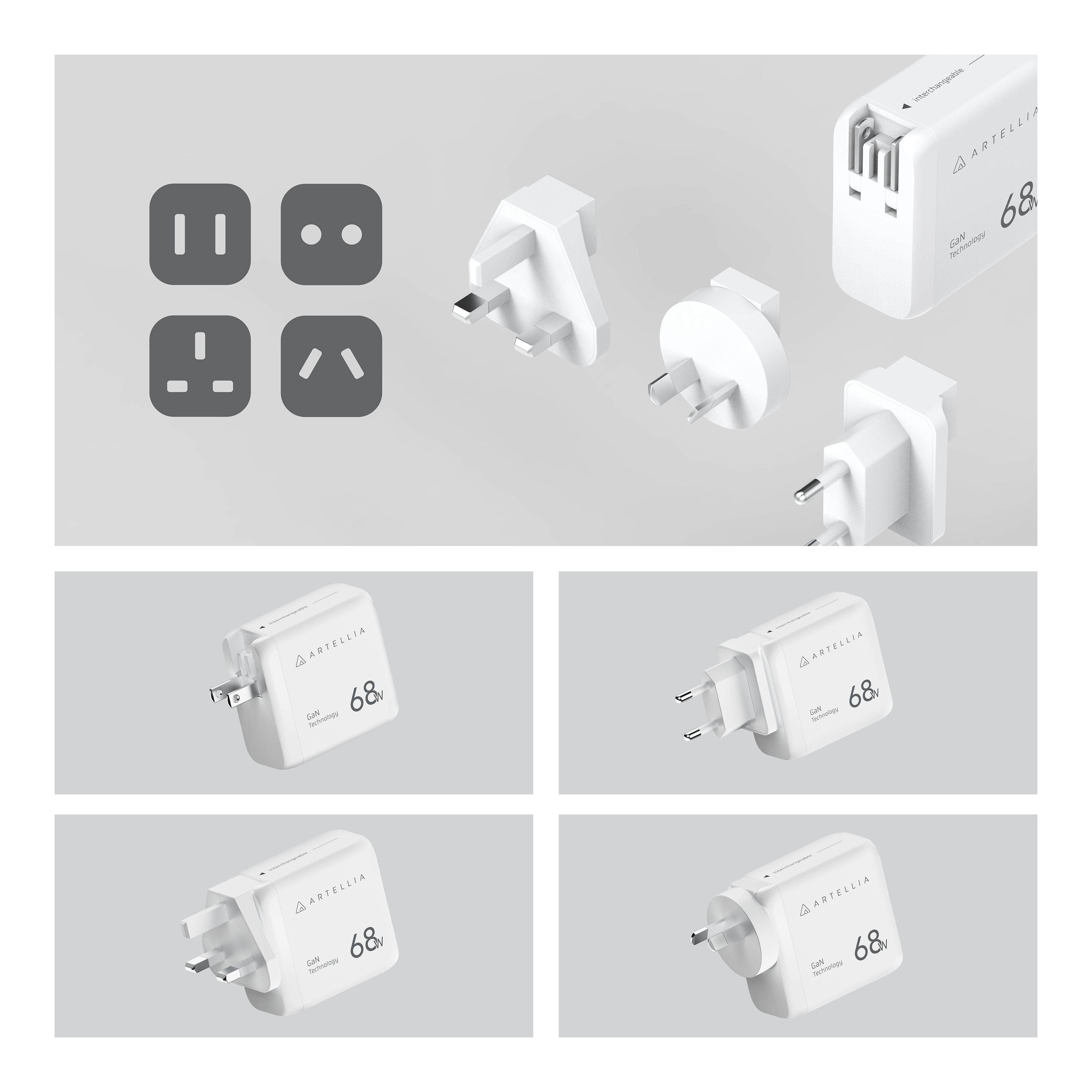 ● 68W ultra-fast charging, 2C+2A plug configuration ● Instant QR code scanning for different regions, plug types, and voltage ● Artellia interchangeable plug system